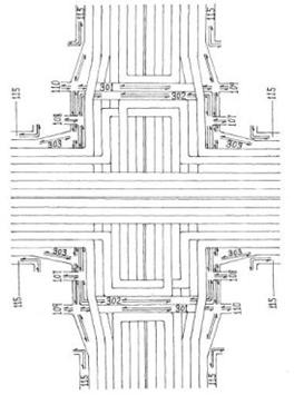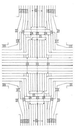 開(kāi)放型人行道115進(jìn)入路口前讓位于電動(dòng)車道。縱向電動(dòng)車道301人行道302位于兩端路面橋上的橫向掉頭車道與縱向高架車道的中間,兩端分別穿越右轉(zhuǎn)彎車道(高度以電動(dòng)車行人順利通過(guò)為宜)。人行道出入口107、108跨越電動(dòng)車道,人行道出入口107-108之間(橫向)為地下通道穿越各縱向車道(高度以電動(dòng)車行人順利通過(guò)為宜)。電動(dòng)車道出入口109-110之間(橫向)為地下通道,穿越人行道入口107、108和各縱向車道(高度以電動(dòng)車行人順利通過(guò)為宜)。