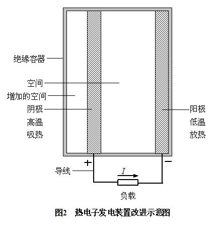 根據(jù)熱電子發(fā)電裝置的結(jié)構(gòu)可知,在陰極溫度、陽極溫度不變的情況下,或在陰極與陽極之間的溫度差不變的情況下,如果使陰極的左表面與絕緣容器的左內(nèi)表面之間增加一個空間(見圖2),則陰極的左表面要向增加的空間發(fā)射熱電子,陰極發(fā)射出的熱電子數(shù)要增加,陰極的電勢要升高,陰極與陽極之間的電勢差要增大,熱電子發(fā)電裝置的輸出功率要增大,熱電轉(zhuǎn)換效率要提高。