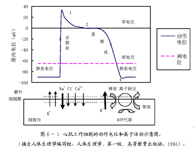 在上圖中,去極化(0期),心肌細(xì)胞受刺激后,靜息電位到達(dá)閾電位時,迅速激活鈉通道,使其開放,造成大量鈉離子內(nèi)流,動作電位迅速升高,鈉通道又迅速失活關(guān)閉;快速復(fù)極化初期(1期),鈉離子內(nèi)流停止,氯離子通透性升高,氯離子內(nèi)流,氯離子通道通透性也迅速下降;緩慢復(fù)極化期(2期),鈣離子緩慢內(nèi)流,與此同時,少量鉀離子外流,鈣離子通道的激活和失活過程均緩慢,故稱慢通道;快速復(fù)極化末期(3期),鉀離子外流;靜息期(4期),此期離子轉(zhuǎn)運活躍,即把動作電位形成期間流入膜內(nèi)的鈉離子,氯離子,鈣離子排出,又把外流的鉀離子攝回,這一過程通過心肌細(xì)胞膜上的Na+-K+泵的作用完成的,需要消耗ATP的生理過程。(本小節(jié)內(nèi)容摘自人體生理學(xué)編寫組:人體生理學(xué).第一版.高等教育出版社,1986)