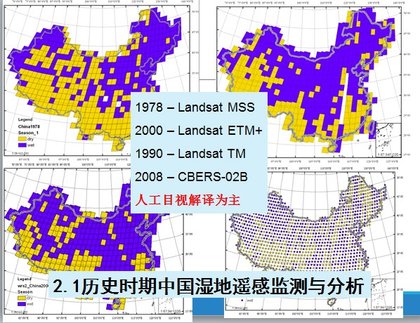 歷史時期中國濕地監(jiān)測與變化分析,因為濕地復雜性太難了,但是當時已經具備了所有遙感數(shù)據(jù),70年代的MSS,能全部覆蓋一次衛(wèi)星數(shù)據(jù)的,這是1978年MSS數(shù)據(jù),到了2000年,1990年,到了2008年我們用中巴衛(wèi)星數(shù)據(jù)做了研究,每期我們都出了大量的數(shù)據(jù),我們只想了解一下我們國家的濕地情況,就用最笨的方法人工目視解譯,做了大概3年時間,前后投入60、70個人做完這項工作,基本上對咱們國家濕地現(xiàn)狀有一個初步的了解。