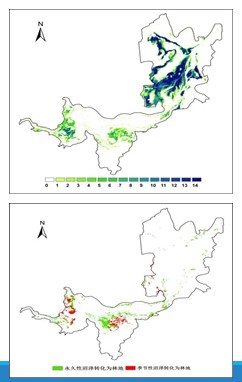 季節(jié)性沼澤減少直接導致珍稀鳥類和魚類食物來源的減少,造成棲息地環(huán)境質量下降甚至破壞;季節(jié)性沼澤的喪失和退化將使洞庭湖濕地的生物多樣性降低。最顯著的是西洞庭湖和南洞庭湖區(qū)林地面積的快速增加,主要由沼澤轉化而來,如圖,其中永久性沼澤轉化為林地共14800 公頃,由季節(jié)性沼澤轉化為林地為7900公頃 。