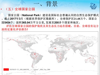保護區(qū)評價,目前開展的是全球國家公園保護現(xiàn)狀和生態(tài)壓力評估正在做工作,首先為什么要干這項工作,加強國家公園保護狀態(tài)和生態(tài)壓力定量化評估,有助于人類了解地球上最美麗的生態(tài)環(huán)境資源的性質和數(shù)量以及人類自身對這些資源產生了什么的壓力,有助于提高人類關于自然保護與持續(xù)發(fā)展的科學認識和面對生態(tài)環(huán)境退化的應對能力。有助于提升我國在世界上生態(tài)環(huán)境保護的地位和話語權。有助于提升我國在全球國家公園建設、生態(tài)安全維護和“一帶一路”戰(zhàn)略布局都具有重要的參考價值。通過研究世界上最好的范例,對中國國家公園體制改革試點、中國國家公園建設彎道超車和中國保護區(qū)事業(yè)健康發(fā)展均具有一定的借鑒意義。