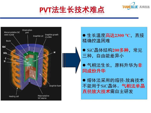 PVT法生長碳化硅存在以下技術難點,一是晶體生長溫度高達2300℃,直接精確控溫困難;二是很難獲得單一的碳化硅晶體結構;三是生長時原料易升華為非同成份其他物質;四是熔體法采用的縮徑-放肩技術不適用于氣相法碳化硅晶體生長,氣相法單晶直徑放大技術需自主研發(fā)。