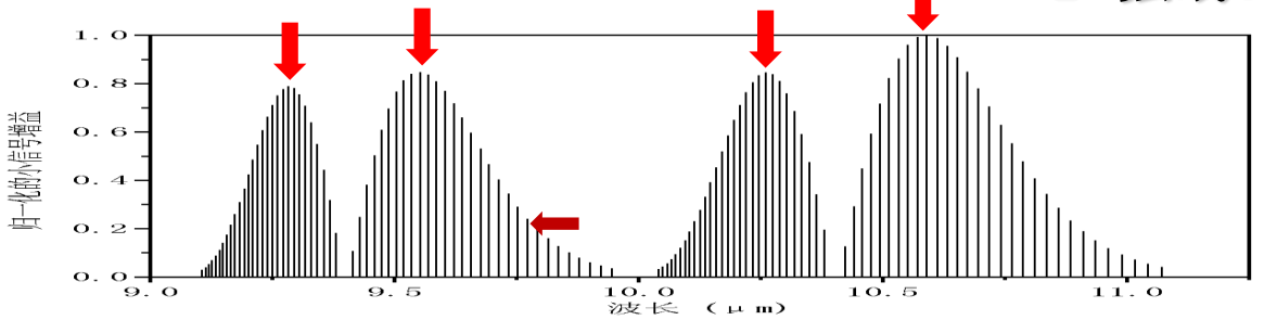 通常CO2激光器波長是10.59mm,這只是CO2激光增益譜中最強的一條譜線。從圖2-3 CO2激光器的譜線圖中可以看出,實際上有四條譜線的增益都比較大,分別為10.59mm、10.25mm、9.55mm及9.27mm。以上四條譜線為各支的強線。但是在很多應用需求中,除輸出這四條強線外還要求輸出某些增益很低的弱線,且實際應用中還需要很高的光束質(zhì)量,因此有較大的研制難度。