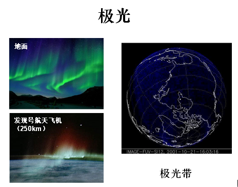太陽風(fēng)的暴發(fā),發(fā)生地球空間暴,會引起高能粒子暴,磁場擾動,形成磁暴,產(chǎn)生電離層暴和熱暴。太陽風(fēng)吹向地球,使磁場偏轉(zhuǎn),會在地球的南北極形成美麗的極光。圖中顯示的極光,有從地面看到的,有從距地球表面250公里的航天飛機上看到的。