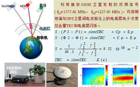 利用接受GNSS衛(wèi)星發(fā)射的雙頻信號,可探測地面與GPS衛(wèi)星間電波路徑上的電離層電子濃度總含量TEC和電離層閃爍。