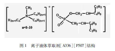 近年來我們開展離子液體萃取劑的研究,例如[A336 ] [ P507]。該結(jié)構(gòu)簡單的理解就是將P507進行有機錢鹽的皂化,有機錢鹽常采用Aliquat336,國內(nèi)商品名稱為N263。[ A336 ] [ P507]的結(jié)構(gòu)如圖1所示,是一種典型的離子液體,所以我們稱之為離子液體萃取劑。