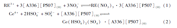 離子液體萃取稀土離子的過程機理還是比較復(fù)雜的,這種復(fù)雜來自于很多方面。其萃取稀土(III)和缽( IV)的機理還是以中性絡(luò)合機理為主,如萃取平衡方程(1)和(2)所示,同時可能還伴隨一些副反應(yīng)。該過程萃取稀土鹽,酸堿消耗比較小,是提高稀土萃取效率的重要方式之一。
