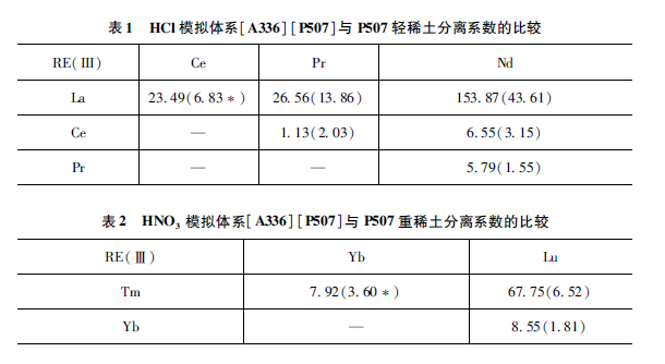P507(III)萃取稀土按照正序萃取,遵循“四分組效應(yīng)”,稀土的分配系數(shù)隨著原子序數(shù)的增加而增大,而堿性萃取劑[A336]C1在HN03體系中通過陰離子交換萃取稀土是倒序萃取,稀土的分配系數(shù)隨著原子序數(shù)的增加而減小。兩種效應(yīng)共同作用,導(dǎo)致[A336 ] [ P507 ]分離稀土選擇性增強,相鄰元素間的分離系數(shù)明顯提高。同時,陽離子[A336]+和陰離子[P507 ]-的離子半徑大,空間位阻增加,也有助于提高稀土(III)的萃取選擇性。模擬實際體系的組分混合物,在HCl體系中在輕稀土間的分離系數(shù)也有較大的提高,尤其是Pr/Nd分離系數(shù)5. 79明顯高于P507體系的1. 55(徐光憲主編,《稀土》,第二版,1995 ) ,見表1。在HN03體系中重稀土Tm/Yb/Lu的分離系數(shù)較大,明顯高于目前的P507體系(李德謙等,中國發(fā)明專利,ZL200510016682. 6 ),見表2。[A336 ] [P507 ]的特殊結(jié)構(gòu)對部分稀土離子分離的選擇性方面比較突出,與其較大的空間位阻有關(guān)。