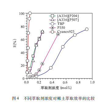 相同條件下在硝酸體系中萃取能力順序比較:TBP(磷酸三丁醋)< P350(甲基磷酸二甲庚醋)< [A336] [P507] < Cyanex923(圖4)。盡管Cyanex923是萃取稀土的優(yōu)良萃取劑,但成本比較高,且難以國產(chǎn)化,實際應(yīng)用中還是受到一定的影響。[A336 ] [ P507」的優(yōu)勢還體現(xiàn)在酸堿消耗低,反萃取完全。