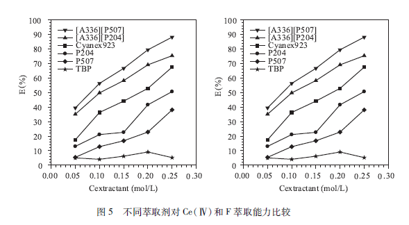 離子液體萃取劑應(yīng)用于H2SO4、體系中萃取鈰( IV)和氟,鈰( IV)與氟以CeF3+絡(luò)合,形成CeF ( HSO4 ) ( SO4 )2· [ A336 ] [P507 ]萃合物。分離鈰( IV),牡和稀土的順序:鈰( IV)>牡(W)>稀土(III ) o萃取劑的萃取能力比較順序:[A336 ] [ P507>Cyanex923 > TBP。對氟的萃取能力有相似的趨勢,其結(jié)果見圖5。我國輕稀土礦含有近50%的缽,將缽(W)與稀土(111)分離,可以大大減少稀土萃取分離的壓槽量,縮短分離流程,降低成本。