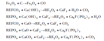 弱磁鐵礦一步法磁化與稀土礦物分解過程的反應(yīng)如下: