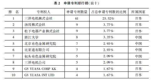 從不同年份上來看,中國專利不斷增加,原來口本比中國多,后來中國慢慢增多。但實用的還是不多,仍然還是一個問題,還得有進一步的提高。另外,從申請單位來看,排在前十名的都是中國和口本的一些單位(表2)。比如說三洋電機株式會社、湯淺株式會社、松下電器產(chǎn)業(yè)株式會社、浙江大學(xué)、北京有色金屬研究院、比亞迪等。