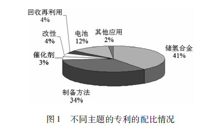 這里面是不同的研究主題分布,還是以儲氫合金的開發(fā)居多一點,然后還有催化劑、改性等(圖1)。我覺得在這里面可能有三個領(lǐng)域在技術(shù)上發(fā)展比較突出一點。第一個就是成分的改變,通過改變儲氫合金成分開發(fā)新的合金提高了鎳氫電池容量,是一個很重要的進步。傳統(tǒng)是ABS型的,后來跟ABS型的和AB2型的結(jié)合到一起,就變成了A2B7型的,這就是口本三洋公司開發(fā)出來的。這個儲氫合金成為了目前研究的主流,容量比傳統(tǒng)的要大很多,成分上的突破是一個很大的進步。第二個是甩帶快淬技術(shù)在儲氫合金粉體制備上的應(yīng)用,原來這種技術(shù)最早是用來制備非晶態(tài)合金的,后來用到了永磁粉體的制備,現(xiàn)在又開始進人到了鎳氫電池上面來了,對于鎳氫電池容量和穩(wěn)定性的提高都有非常大的幫助。第三個重要的突破的是儲氫合金表面改性,表面有一層鎳,可以進一步提高電導(dǎo)率,增加電流。這三方面是在技術(shù)上有了比較大的提高和發(fā)展。