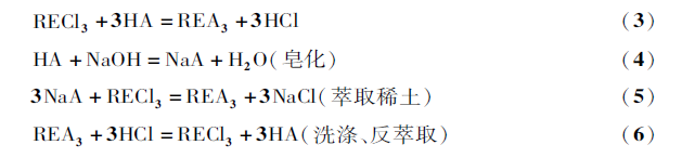 萃取分離過程主要利用有機萃取劑萃取料液中易萃組分,獲得高純度的難萃組分,通過洗滌有機相的難萃組分獲得純的易萃組分,達到分離目的。目前稀土分離均使用酸性萃取劑(HA),萃取過程可用反應(yīng)(3)表示,為了提高和穩(wěn)定萃取劑的萃取分離能力,一般均對酸性萃取劑進行皂化后再與待分離的稀土料液進行萃取交換,過程為反應(yīng)(4),(5),負載稀土的有機相用鹽酸進行洗滌