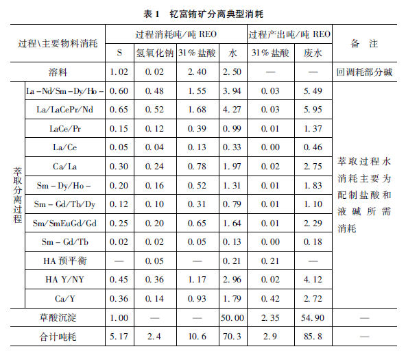 從目前的稀土分離基本工業(yè)流程,不難注意到,各段工藝間相對獨立,過程中消耗酸堿等化工原料和水,最終處理后作為廢水排放。以中憶富鋪稀土原料分離為例,典型試劑消耗如表1,每分離提純1噸稀土氧化物,消耗10噸左右的鹽酸、2. 4噸燒堿等化工材料,產(chǎn)生85噸廢水,其中含鹽量6. 8噸。