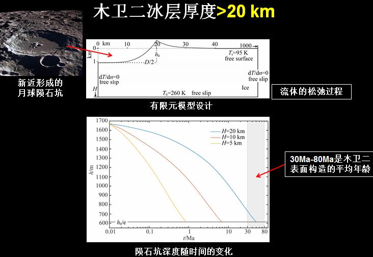 冰層厚度很重要:厚的冰層可能發(fā)生對流,有利于表面與水的連通;過薄的冰層不利于對流的發(fā)生,限制了表面與水的連通。動(dòng)力學(xué)數(shù)值模擬揭示:木衛(wèi)二冰層厚度大于20km。