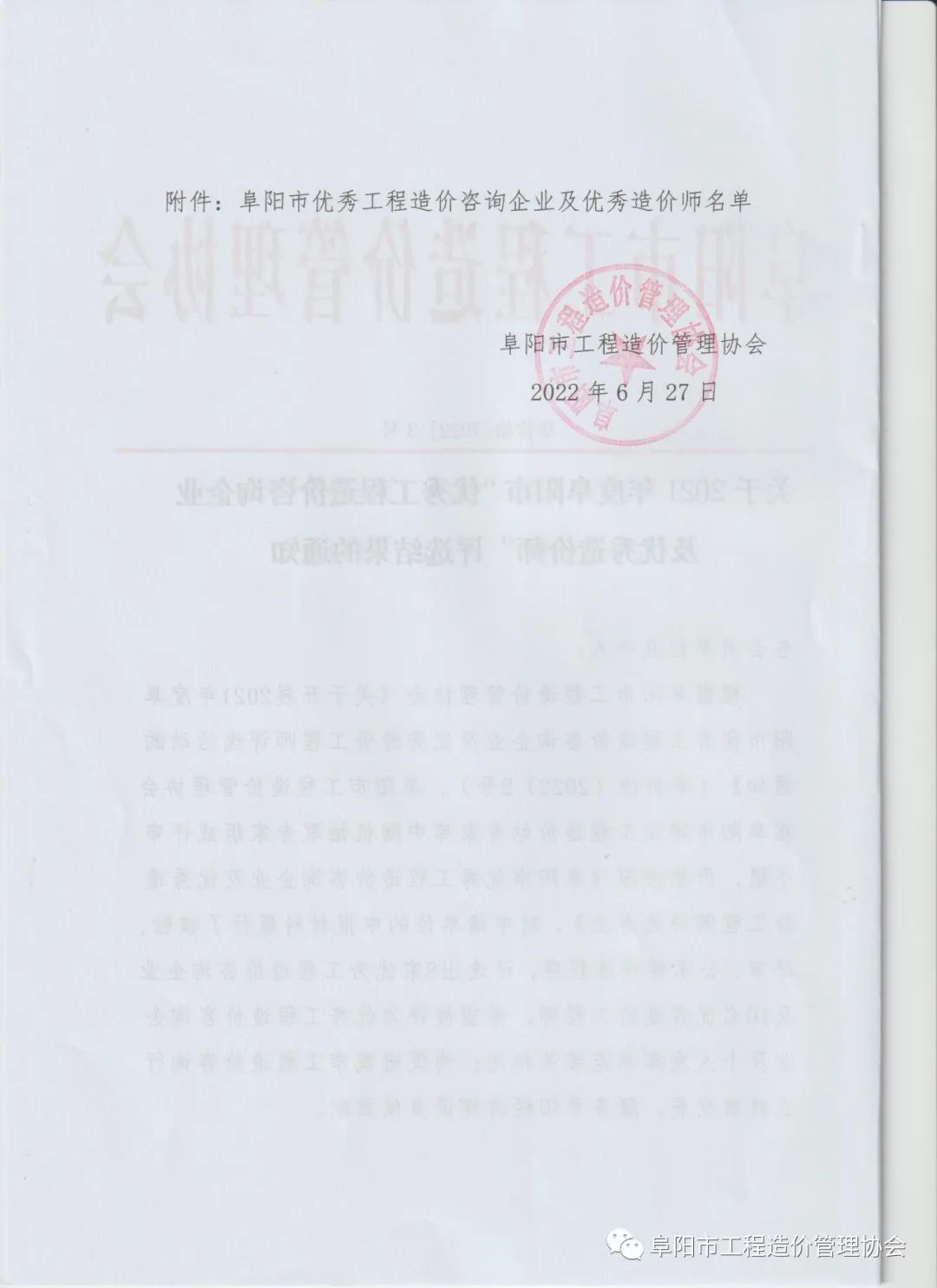 關(guān)于2021年度阜陽市“優(yōu)秀工程造價咨詢企業(yè)及優(yōu)秀造價師”評選結(jié)果的通知 作者: 安徽新天源建設咨詢有限公司 最后修訂: 2022-07-06 10:23:18 摘要: